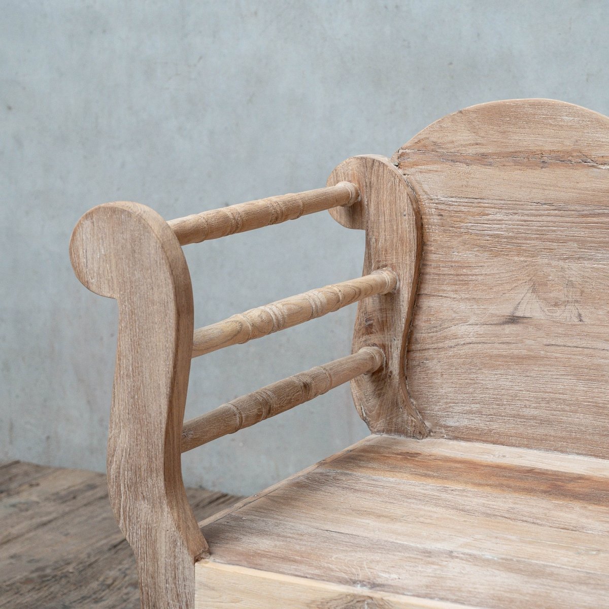 The Byonis Bench with Arm, crafted from reclaimed teakwood, features a turning design, tapered legs, and a cream white finish. Perfect for outdoor spaces, living rooms, home gardens, or offices, it brings both style and comfort.