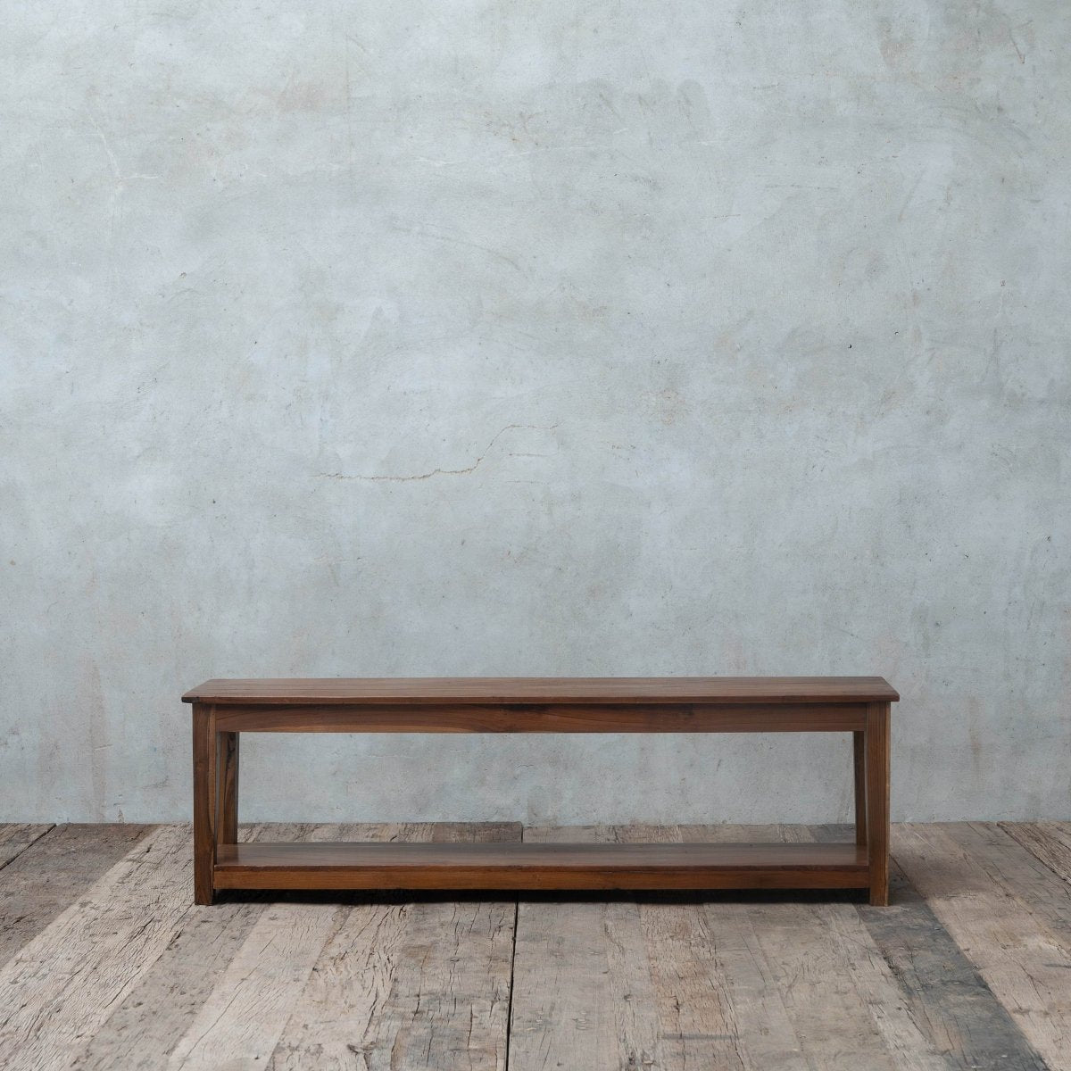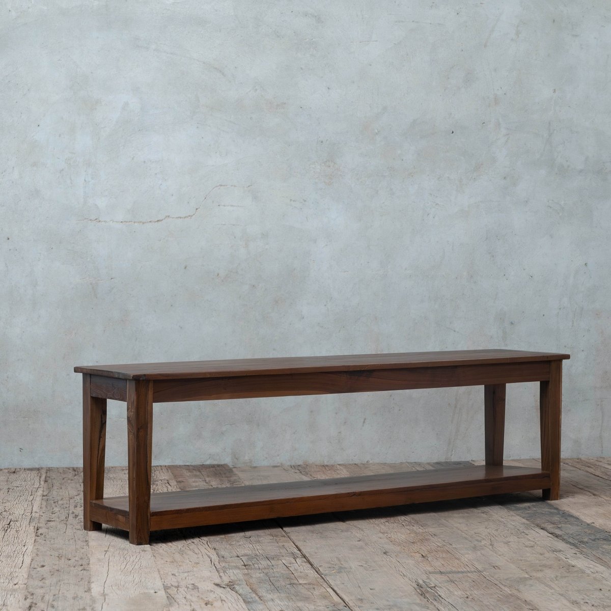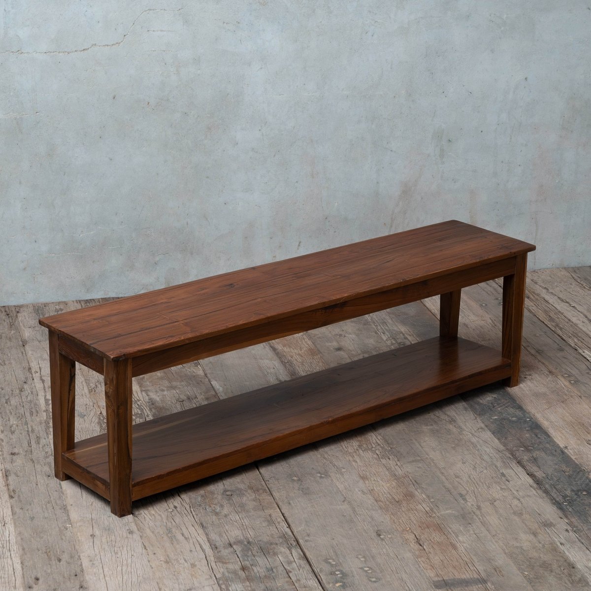 Crafted from reclaimed teakwood, the Deos Bench features tapered legs and an extra storage shelf. With its medium walnut finish, it's a functional and stylish piece for entryways, hallways, living rooms, or kitchens.