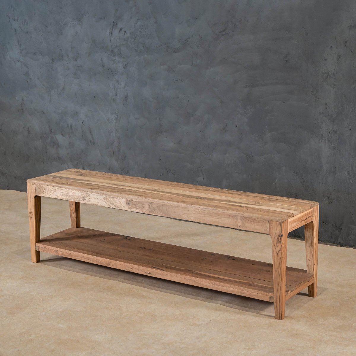 The Relve Bench, crafted from reclaimed teakwood, combines tapered legs with an extra storage shelf. Its medium walnut finish makes it a perfect fit for entryways, hallways, living rooms, or kitchens.
