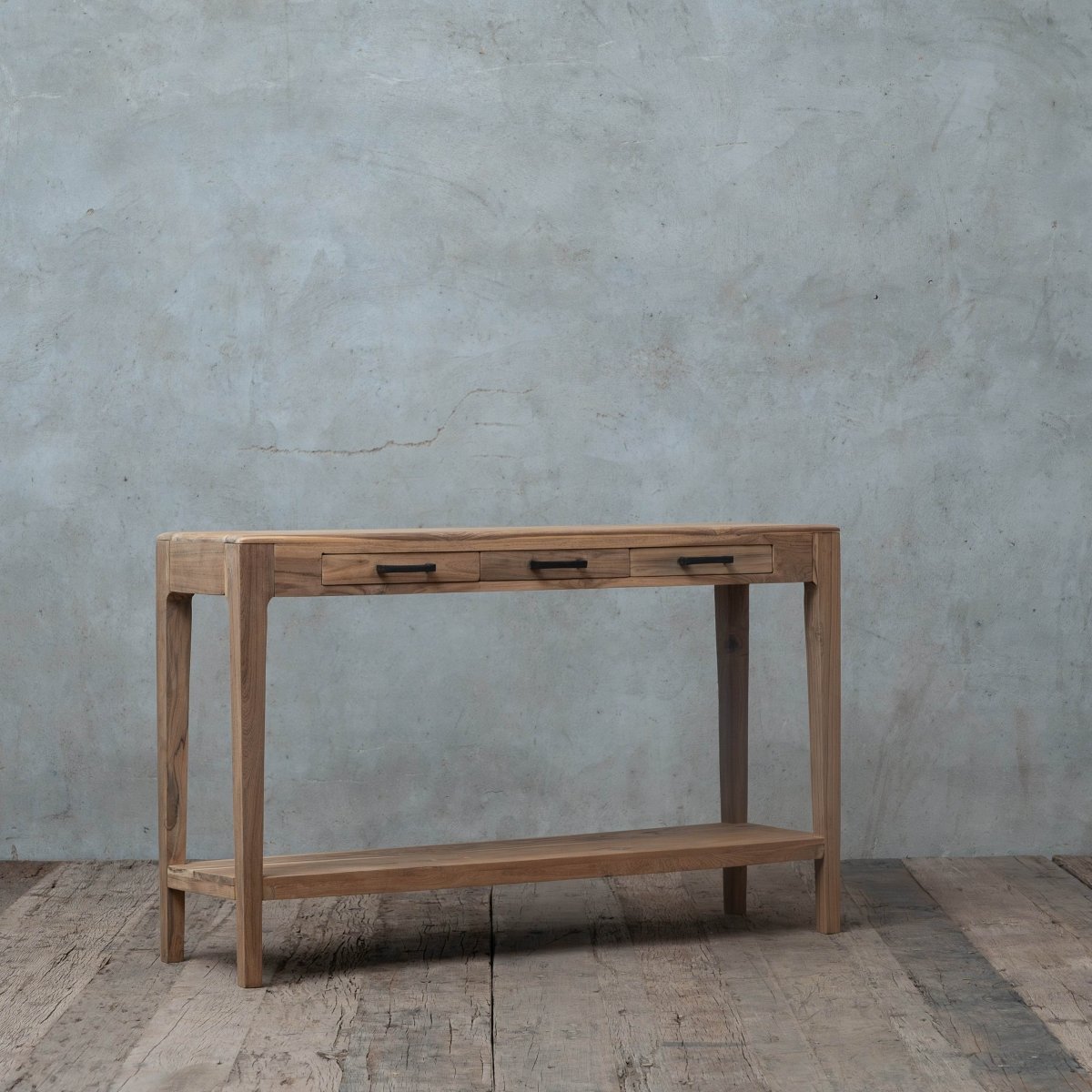 The Preko Console Table, crafted from reclaimed teakwood, features tapered legs, a slim profile, 3 drawers, and an extra storage shelf. Its natural smooth finish makes it an ideal fit for entryways, hallways, living rooms, or kitchens.