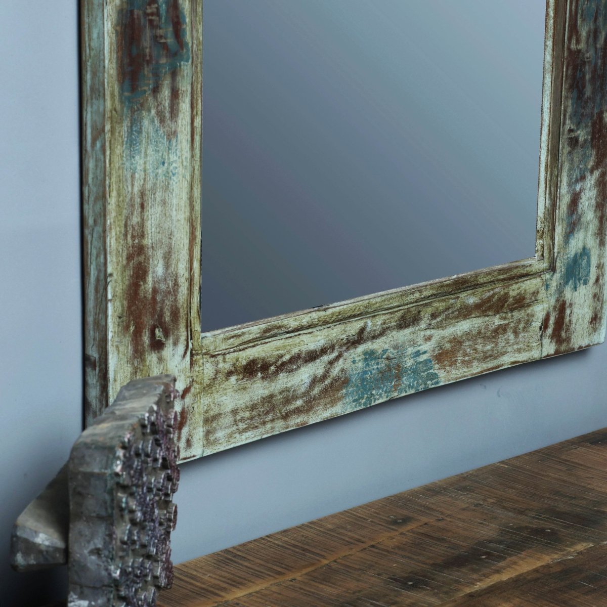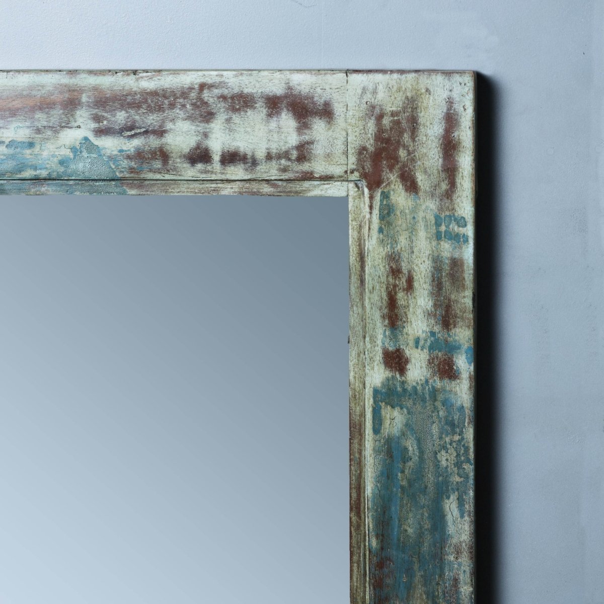 The Reclaimed Wooden Mirror in Antique Blue Finish is handcrafted from reclaimed wood, ensuring each piece is unique and environmentally friendly. The antique blue finish adds a touch of vintage charm, making it a standout piece in any room.