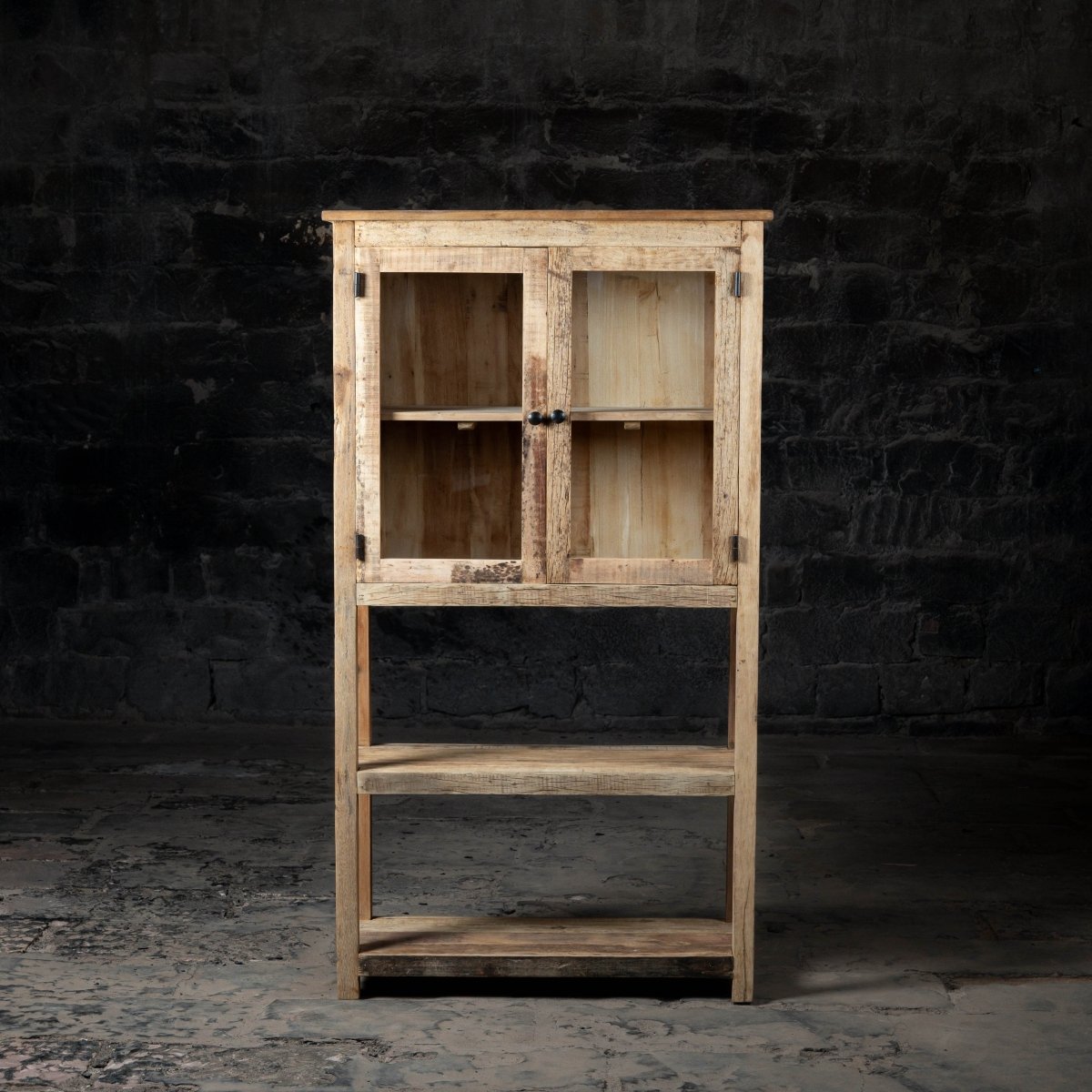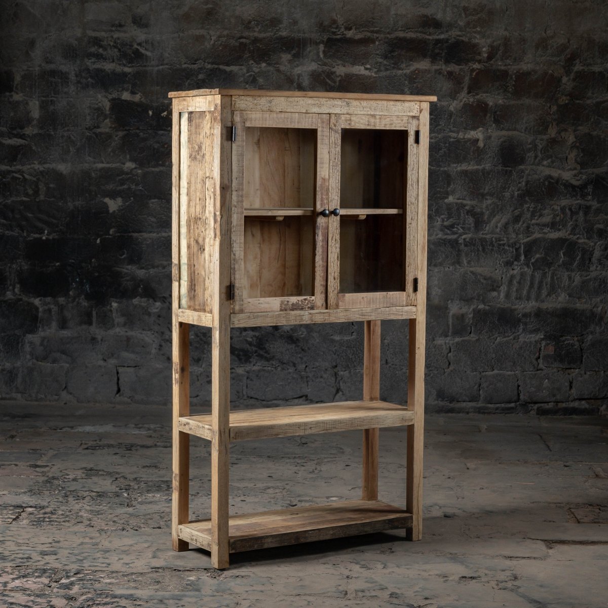 The cabinet is crafted from reclaimed weathered wood, which gives it a unique rustic character, natural grain patterns, and long-lasting durability. Each piece of wood is carefully selected for quality and visual appeal.