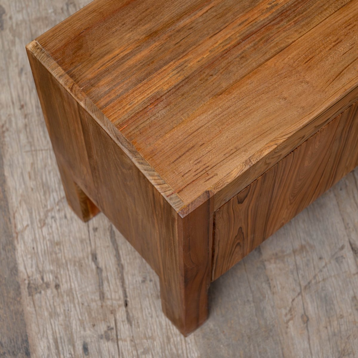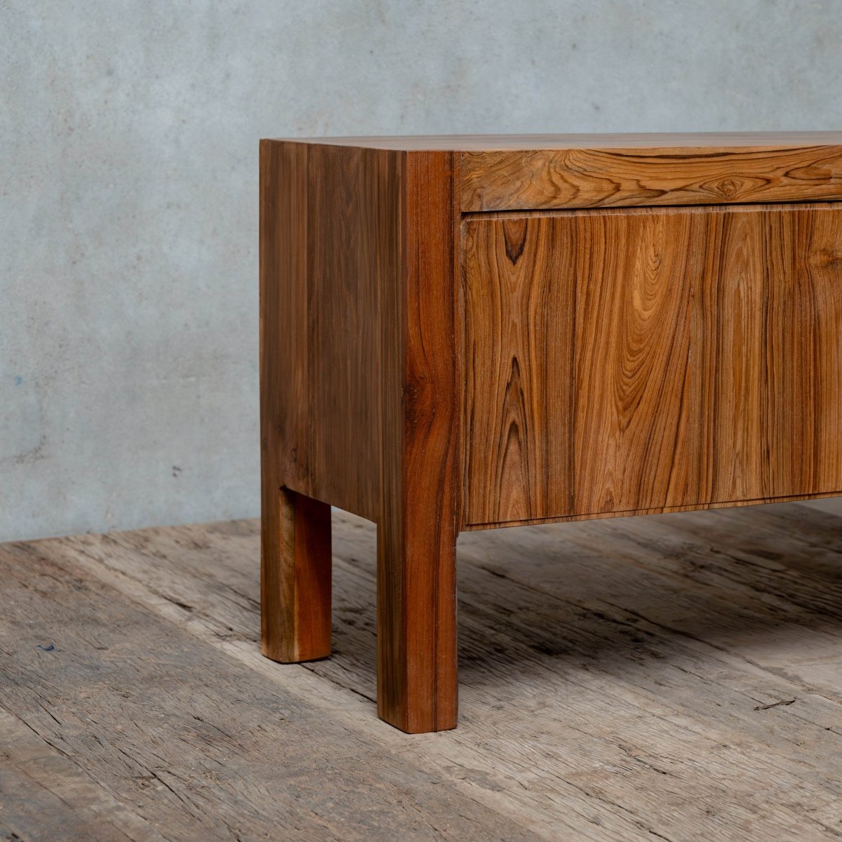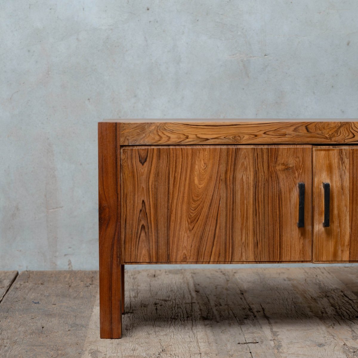 The Amigo TV Cabinet, crafted from reclaimed teakwood, offers a simple and modern design. With a natural lacquer finish, it's a sleek and functional piece suitable for living rooms, bedrooms, or hallways.