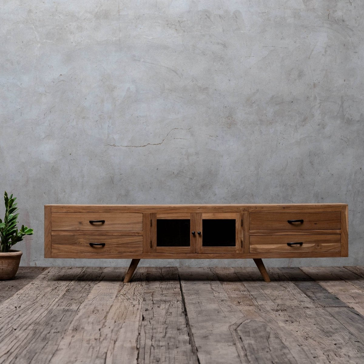 The Celestia TV Stand, crafted from reclaimed teakwood, merges rugged charm with modern functionality. Its sturdy design and stylish finish make it an ideal centerpiece for your entertainment setup.