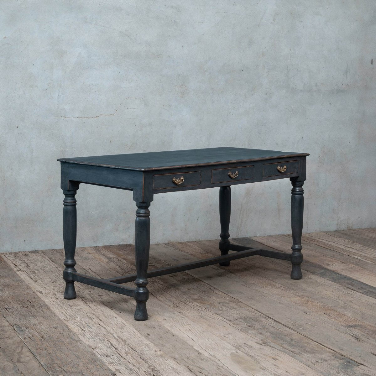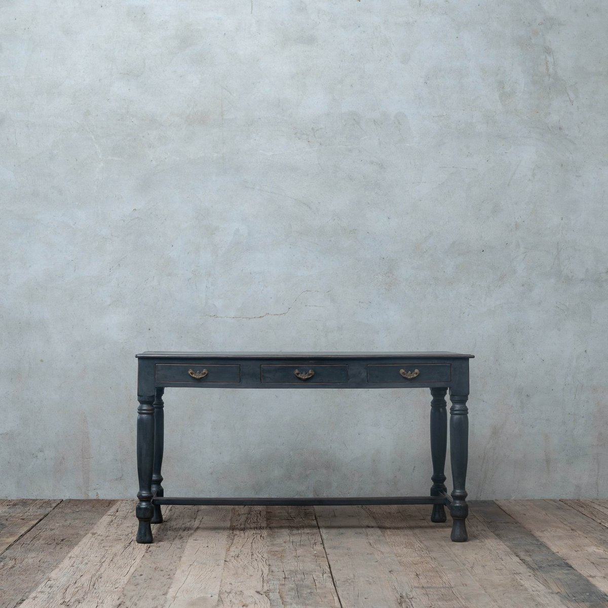 The Alco Study Table, crafted from reclaimed teakwood, features traditional turning legs, a solid top, and three spacious drawers. With its vintage grey finish and complete knock-down design, it’s perfect for any home office or study room.